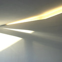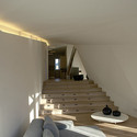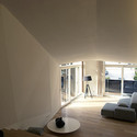 The interior spaces are the reflection of the exterior geometry with folded planes accentuating the flow through the open split-level plan.Their character is determined by the transgressions from the Cartesian orthogonal layout (determined in part by the structure below and functional requirements) towards the soft and fluid morphology of the roofscape.