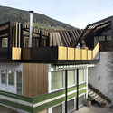 The project is formed by a series of steel and timber frames that deform to recreate the smooth hillsides of the surrounding dolomites. This partly accessible roofscape also determines the spatial character inside- the spaces are enfolded by an angular and dynamic series of planes creating new and ever-changing perspectives and spatial constellations.