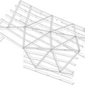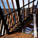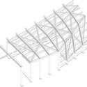 The conceptual and geometric striation was translated into a series of outside steel belts from which prefabricated composite wall/ceiling panels are suspended. Small T-sections span in perpendicular direction to the major steelwork to support the additional timber sections that complete the outer layer.