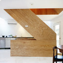 The house is finished in marine plywood, usually used in boat-building. The grain is broad and pronounced, creating the appearance of a huge piece of furniture. Each floor of XS has a different look and feel (marble on the first floor, oak plywood on the second), but all are connected by a pared-down wooden staircase that threads through the space.