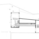 The communal spaces for the family are located within the main volume, a glass box ensconced in the garden. The architects conceived of the site as a room bounded by vegetation and terrain; the living room set within a larger room. Broad glass windows puncture the concrete wall at garden level so that the living spaces appear fully wrapped in glass. The walls create a permeable barrier between interior and exterior and slide to open fully onto the garden.