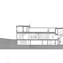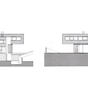 The continuity of each apartment's cladding is interrupted only by bands of strip windows. The bathrooms are housed in opaque, rectangular volumes set back from the exterior walls. Slender steel columns painted shades of black and gray support the larger of the two apartments, which dominates the street facade.