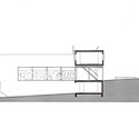 The apartments cantilever beyond the central volume, hovering over the garden. Both are clad in corrugated aluminum of contrasting tones, one with an aluminum finish and the other colored red by a copper lacquer. The corrugations are oriented horizontally, reinforcing the orientation of the apartments in contrast to the central volume. The material covers the underside of each apartment box, extending even across the interior, emphasizing the reading of volume over surface. The stair, which ascends from living space to apartment overhead, appears to slip through an aperture in the volume of continuous aluminum.