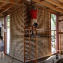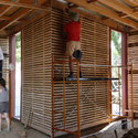 The firm focused on the development of a complex building skin and worked to integrate traditional construction methods with contemporary materials. The wood found on the previous building was applied in the structural framing of the house while the stone of the ancient walls was utilized in the foundation system. The house is also a “do-it-yourself” experiment where the residents play a large role in the construction of the cabin.