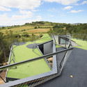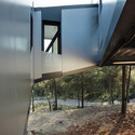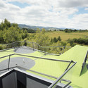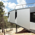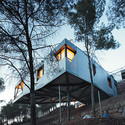 The structural solution of the project is a continuous steel tube fitted in the earth at the extremes. A steel tube covered with aluminum panels which flies over the trees of the parcel.