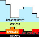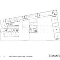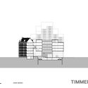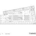 Rather than being yet another statement in Rotterdam’s crowded history of revisionist planning and cacophony of architectural styles, the ambiguous mass of the Timmerhuis tries to mediate between the existing buildings surrounding it. The axis between the existing town hall and the post office coincides with the axis of symmetry of the Timmerhuis, and the street between these two buildings continues into a passageway to the Haagseveer. The Timmerhuis integrates with the neighboring Stadtimmerhuis by maintaining the same floor heights, while the plinth height of 20m conforms to the character of the surrounding Laurenskwartier.