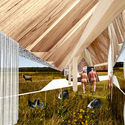 Jury Commentary: The success of the second place proposal for the Blue Clay Country Spa competition lies in its strong response to the site and its playful reinterpretation of vernacular form. The project consists of a primary linear structure: a thatched roof longhouse spanning from the forest edge to the lake and rooted in the traditional Kurzeme typology typical of the region. A second linear element—a strip of productive landscape containing gardens, outdoor dining, a pool, and other ecological services—intersects the longhouse at an angle and divides the site into disparate quadrants. Within the structure, a series of whimsical follies contain the program and the remaining space is effectively open to the outdoors, creating a blurred threshold between landscape and interior. This linear parti, combined with the calculated rhythm of enclosed elements, define an interior procession from the forest to the lake, while the porosity of the structure allows for visitors to filter into the landscape. The strength of the linear strategy is further emphasized by the scale of the traditional thatched roof, forming a long opaque bar against the backdrop of trees, isolating the separated landscape spaces and creating peaceful, intimate realms while allowing permeation through the building and its inner world.